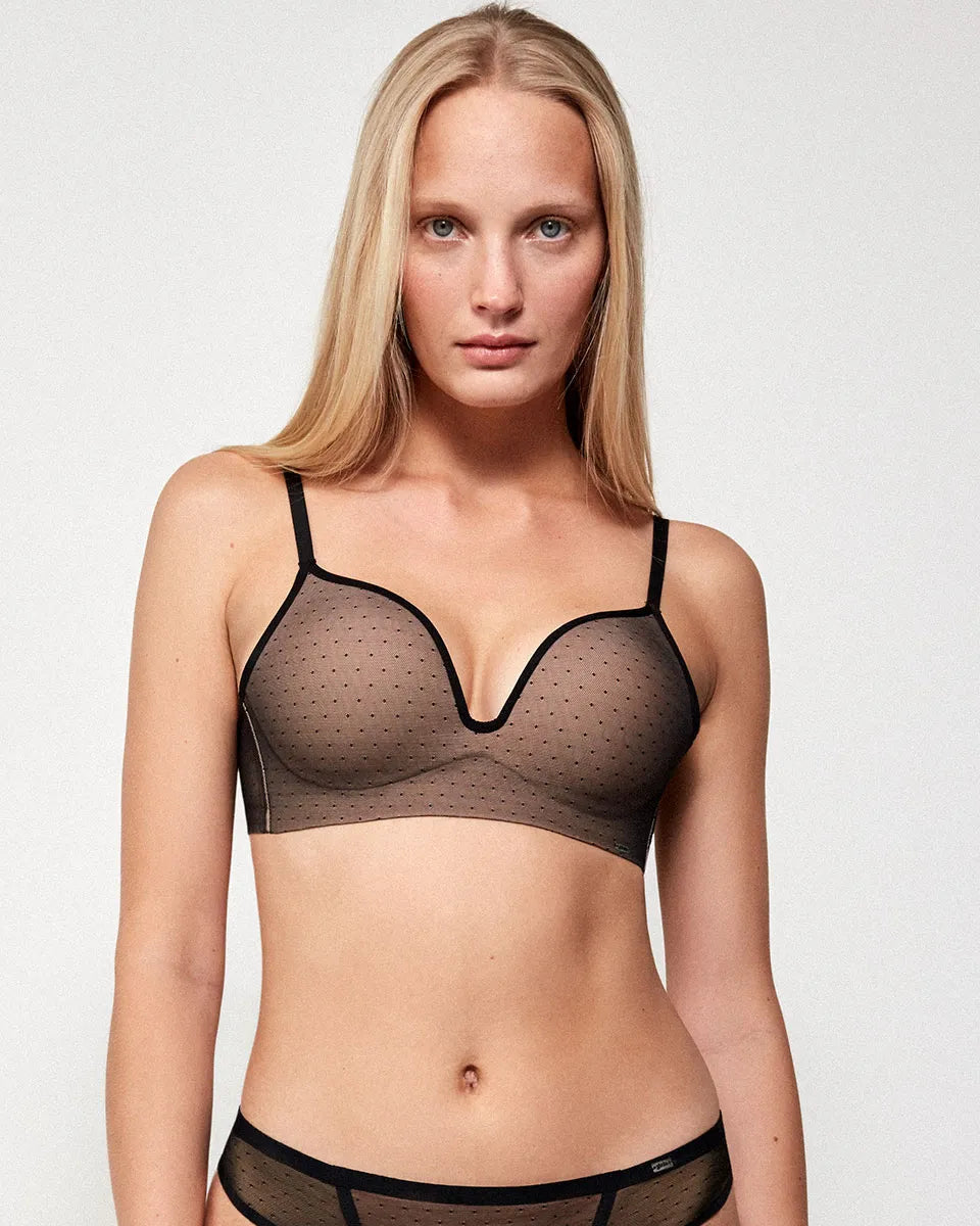 Sujetador push up sin aro, ideal para llevar con prendas escotadas. Tejido plumetti delicado y femenino, adherido a otro de microfibra que se adapta al cuerpo. Acabados invisibles y termofusionados que no marcan, y garantizan una gran comodidad.