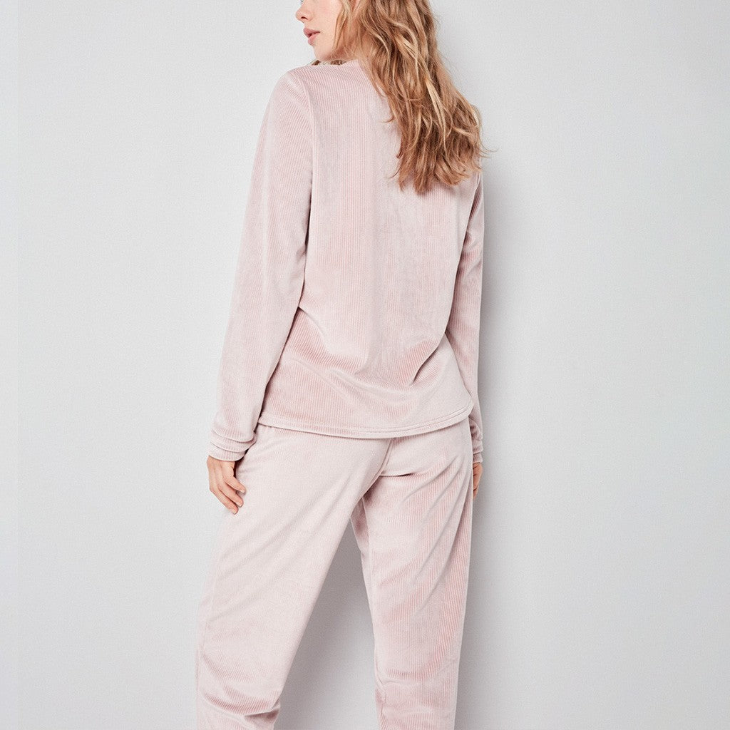 Conjunto de mujer para estar en casa de tejido muy suave tipo micropana con bordado en el pecho y cintura ajustable con cordón.