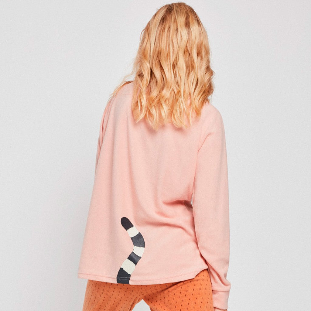 Pijama para mujer confeccionado en suave género polar, compuesto por camiseta de manga larga terminada con puños, con carita de gato y adorno de orejas. Pantalón con estampación de animal print.