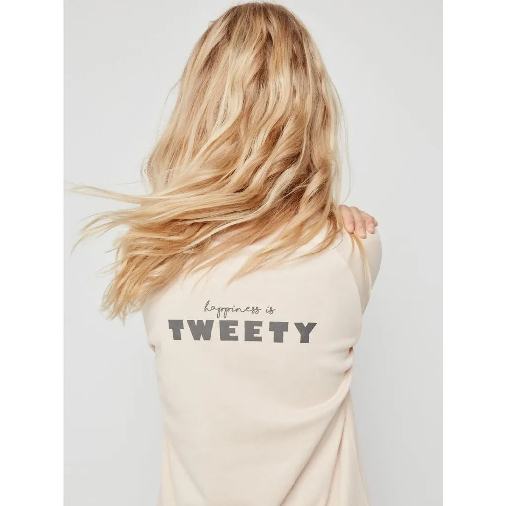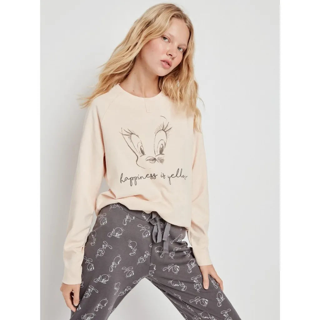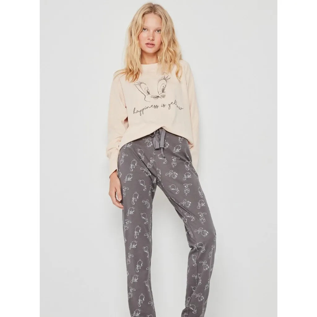 Pijama para mujer de invierno Looney Tunes 2/1990 de la marca Gisela. Se compone de dos piezas: una camiseta de manga larga con estampado central y tapeta de dos botones, pantalón largo con puño y estampado a contraste con ajustable en cintura con goma y lazo.