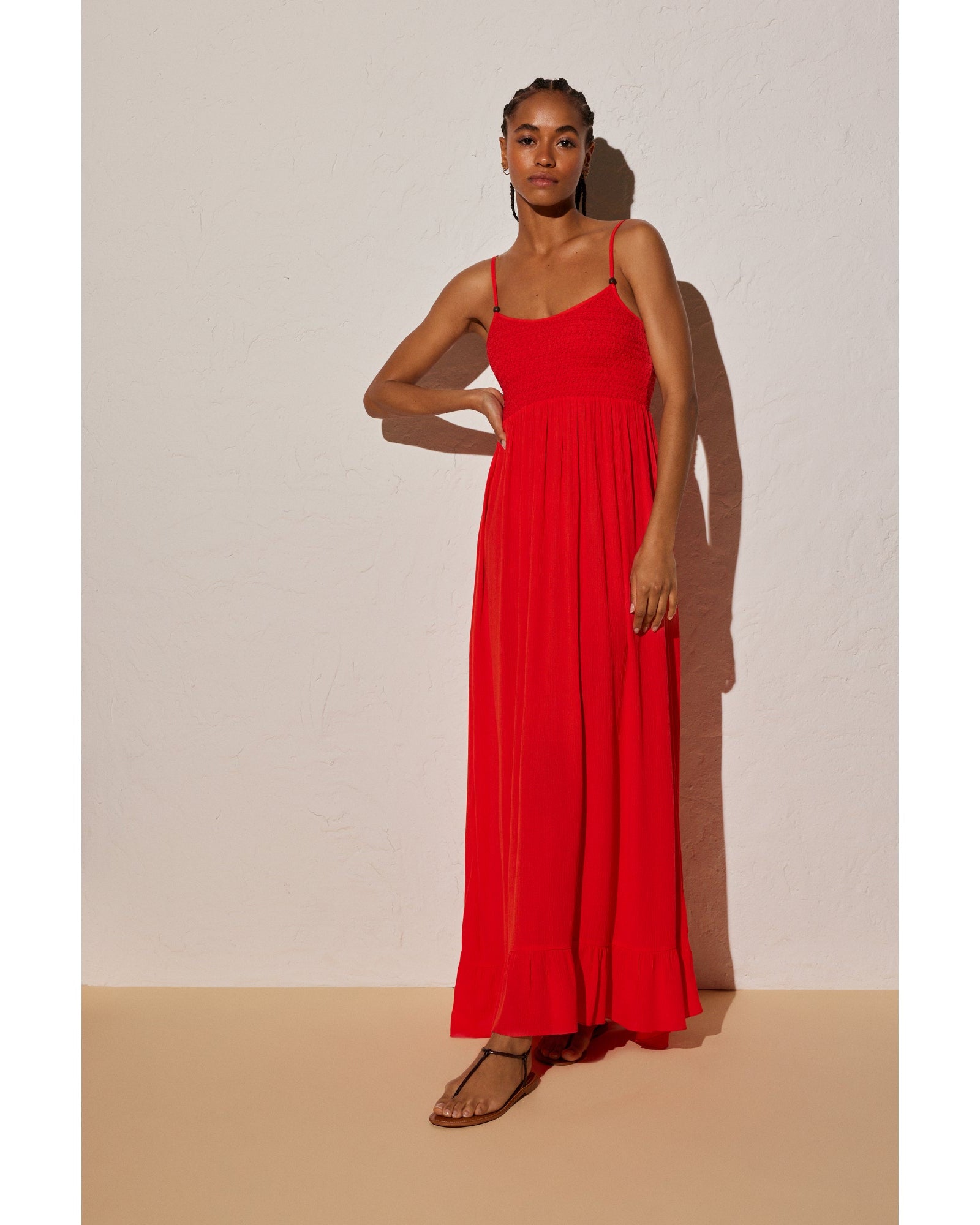 Vestido largo de hombros descubiertos y tirantes ajustables. Nido de abeja en la parte superior del vestido. Diseño fresco y ligero ideal para la temporada de verano.